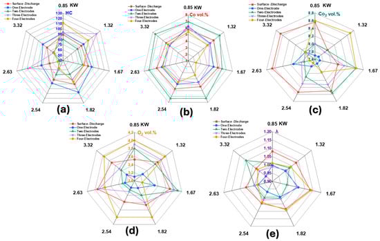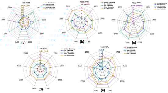 Radar plots (Figure 10) illustrate how engine speed, exhaust emissions (HC, CO, CO2, O2), and air–fuel ratio (λ) vary with the number of spark plug electrodes (one to four). Each plot represents a specific engine speed, with radial axes indicating parameter values (concentric circles show magnitude). These visuals suggest that, generally, higher RPMs result in lower emissions and a better air–fuel ratio, suggesting more efficient engine operation. Optimal RPM for minimum emissions varies; for example, HC is lowest around 2700 RPM, while CO decreases with increasing RPM. CO2 exhibits a less consistent trend, with slight growth at the highest RPM (3000), likely due to a richer mixture that increases power. More spark plug electrodes (three or four) generally result in lower emissions and a λ closer to the ideal 1, indicating more complete combustion. Operating around 2700 RPM with a three- or four-electrode spark plug offers the best balance of performance and low emissions.