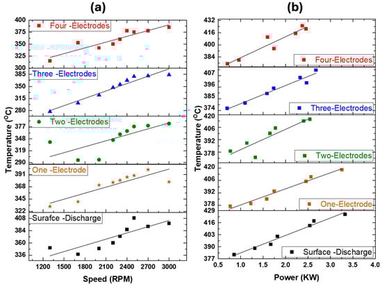 Figure 12 analyzes exhaust gas temperature. Figure 11a shows that at no load (idling), exhaust gas temperature increases with engine speed at a constant power output. This positive correlation exists across all spark plug types due to the increased fuel consumption required to maintain higher speeds, even without an external load. Internal friction requires more fuel burn, leading to more combustion and higher temperatures [,]. At lower idle speeds, the number of spark plug electrodes minimally impacts temperature. However, multiple electrodes generally result in lower temperatures at higher idle speeds, indicating that improved combustion efficiency becomes more critical. Figure 11b demonstrates that, at a constant 2500 rpm, the exhaust gas temperature increases strongly with the consumed power (varying load) across all electrode types, highlighting power output as a key factor in driving temperature. Despite power’s influence, multiple electrodes consistently produce slightly lower temperatures, suggesting better combustion efficiency under load. The figures show that engine speed is crucial at constant power, while power consumption dominates at constant speed. Notably, multiple electrodes, especially the “Surface-Discharge” type, consistently lead to lower exhaust temperatures, suggesting the potential for improved combustion and reduced emissions. These findings underscore the importance of optimizing engine parameters and spark plug design to achieve the desired performance and emissions.
