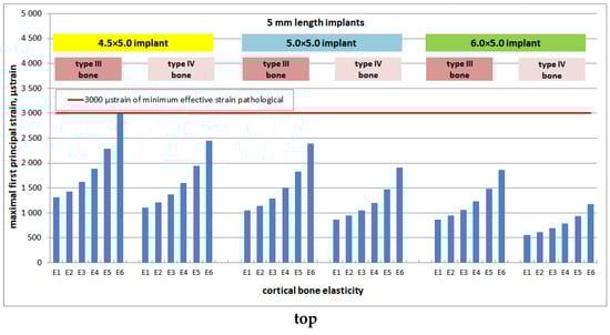 Dependence of maximal first principal strains (MFPSs) in cortical bone on its modulus of elasticity for implants of length 5.0 mm (top), 6.0 mm (middle), 8.0 mm (bottom) placed into bone segments of type III and IV bone and the studied E1–E6 degrees of patient-specific cortical bone elasticity. Red line corresponds to 3000 microstrain of Frost “minimum effective strain pathological” (MESP).