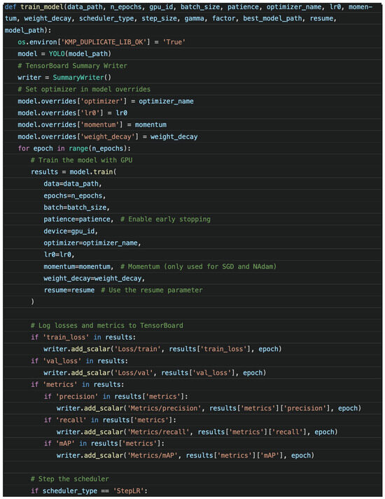 During the training process, YAML files were crucial, as they determined how the algorithm would learn and utilize information from the dataset. The Ultralytics library provides training materials, including the configuration files for YOLOv5 Nano (yolov5n.yaml), YOLOv8 Nano (yolov8n.yaml), YOLOv8 Small (yolov8s.yaml) and YOLOv9 (Compact and Enhanced). These configuration files represent different versions of YOLO, which were used as learning materials for custom-trained models during the study [13]. The Ultralytics GitHub repository [13] initially provided the code used during the training. Modifications were made to suit the specific requirements of this study better. The code is divided into two parts, where “function.py” contains most of the functions that control the parameters of the training process, while the other one, namely “main.py”, allows the user to adjust the value of the perimeters and return it to “function.py”. Figure 3 demonstrates the code in “main.py”.