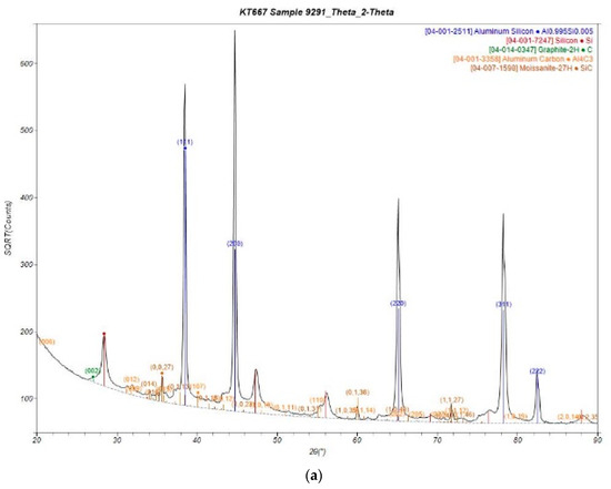 In the XRD analysis of SiC/Al:2/98 as shown in Figure 19, components such as aluminum (or aluminum–silicon) and silicon from AlSi10Mg, and silicon carbide, were detected. It confirms that silicon carbide powder (melting temperature 2830 °C) is distributed without being completely melted through the detection of SiC crystals when compared with the results of AlSi10Mg (melting temperature 570 °C).