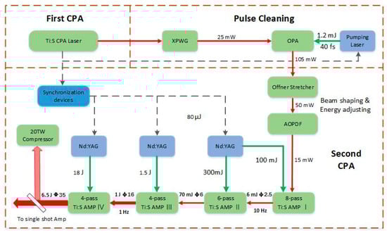 To improve contrast and to suppress amplified spontaneous emission, all multipass amplifications are employed throughout, rather than the regenerative amplifier first stage that was used in the SULF prototype []. An outline diagram of the SULF front end is shown in Figure 1. Four stages of laser amplifiers are employed, and each stage is followed optical beam expansion. The main energy of an amplified pulse is used for further amplification. About 0.8 J of the pulse energy is directed to a grating compressor by a beam splitter with a 1:7 splitting ratio. The compressor has an optical transmittance of approximately 65%; thus, a peak output power exceeding 20 TW can be obtained.