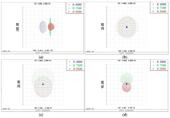 It is difficult to obtain a high-quality beam from the traditional Offner grating stretcher [] if the beam has a broadband spectrum exceeding 100 nm. We establish a raytracing model of the grating stretchers, and present the simulated far-field images in Figure 2. The focal length of the lens we used is 0.5 m, and the aperture value of the simulation is 5 mm. These results are for the same test environment, beam size, time-expansion ratio, and spacing of equivalent grating pairs, for a central wavelength of 800 nm. It is clear from Figure 2a that for a bandwidth of 100 nm, the spot of a single-grating type starts to degrade and shows spatial dispersion. In the raytracing model, the roof prism is located to retroreflect the light. In practice, the prism or roof mirror is usually off center, which aggravates the deterioration of the spot. Thus, the single-grating expander outputs a beam of poor quality.
