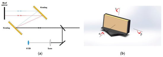 The angular dispersion is determined by the three rotation angles α, β, and γ of the grating as shown in Figure 4b, where, α regulates the grating ruling direction, β maintains the grating plane upright, and γ modifies the incident angle of the beam. According to the analyses and experimental results of Liu [], these three-degrees-of-freedom affect the spatial chirp simultaneously, which makes grating adjustment challenging. For the above-mentioned reasons, we are motivated to not only ensure the accuracy of grating angles, but also to establish a standard for grating attitude.