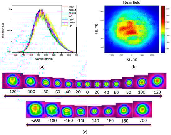 Measurement results at the output of the Offner stretcher. (a) the spectrum of the output pulse; (b) the near-field spot; (c) the far-field spot. Offsets are in millimeters.