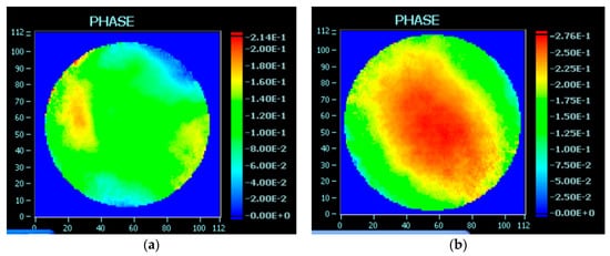 Wavefront phase near the double-grating Offner stretcher, where the units are wavelength (800 nm). (a) Before stretcher; (b) after stretcher.