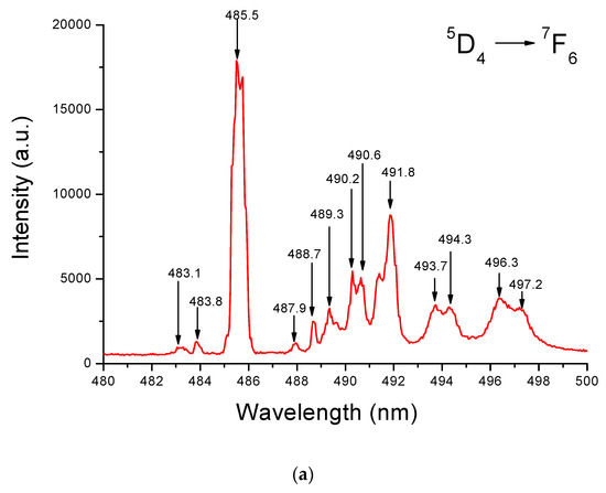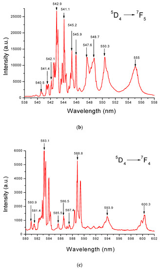 The most intensive part of the spectrum is represented by the series of lines related to the transitions 5D4→7F5 for which |Δ J| = 1 that means that they belong to the allowed transitions in a free ion. The fine structure in each part is caused by the crystal field splitting with possible participation of the vibronic sidebands. Fragments of the energy transitions 5D4→7FJ (J = 6, 5, 4, 3) and the pattern optical lines are given in Figure 4a–d. The remaining allowed transitions J = 2, 1, 0 which appear under 325 nm excitation proved to be very weak and for this reason were not taken into consideration.