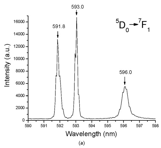 The main transitions 5D0→7FJ (J = 1,2, 3, 4) and the pattern of optical lines are given in Figure 5a–d. The remaining transitions J = 5, 6, which appear under 325 nm excitation proved to be very weak and for this reason were not taken into consideration.