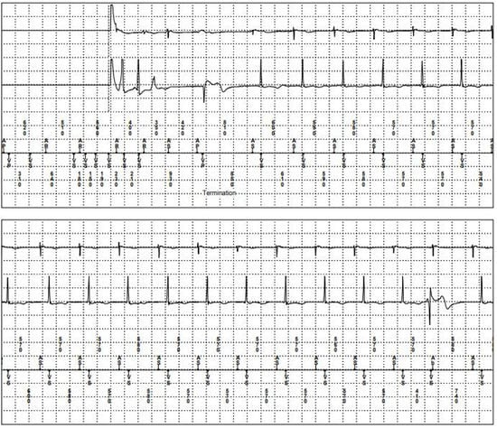 Transthoracic echocardiography showed normal heart structure and function. Three months after the pacemaker implantation she experienced a syncope. The pacemaker analysis at this time again showed runs of nonsustained ventricular tachycardia with a ventricular rate up to 300 bpm (Figure 1).