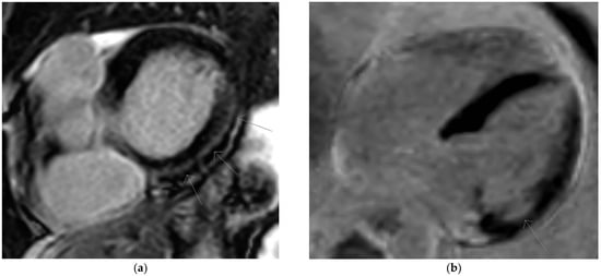 Cardiac magnetic resonance. (a,b) Late gadolinium enhancement (LGE) inferolateral basal midmyocardial and subepicardial (arrows) in two chamber and four chamber views.