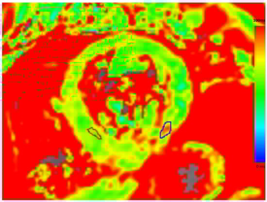 T2 mapping: prolonged myocardial relaxation inferolateral basal segment of the left ventricle up to 62–64 msec.