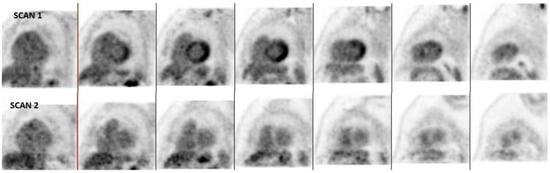 FDG PET-CT images at the time of diagnosis (SCAN 1) and 3 months after cessation of corticosteroids (SCAN 2). Slice 12 mm. Zoom × 3.