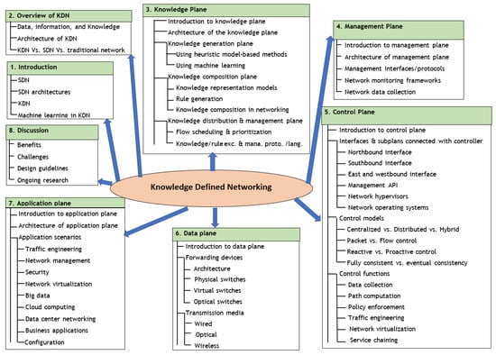 Early surveys were totally focused on SDN architecture and applications without any review of intelligent networking []. More recent surveys have reviewed the concept of knowledge-based networking by categorizing machine learning applications in SDN and identifying challenges in applying machine learning in SDN [,]. The survey carried out in [] collects and reviews machine learning-based SDN solutions that emphasize machine learning-based solutions, evaluation parameters, and evaluation environments. More closely related to our survey is the survey carried out in [], which provides an overview of the KDN architecture. However, the previously mentioned work discussed more on machine learning-based applications applicable in KDN and challenges associated with those applications rather than reviewing on the whole paradigm itself. However, our survey comprehensively reviews existing protocols, languages, standards, interfaces, models, and functions related to each plane of the KDN architecture and, finally, discusses the benefits and challenges, providing design guidelines and recommendations, thus providing a complete tutorial on the knowledge-defined networking concept to the reader, with reference to the existing literature that is analyzed and discussed. The hierarchical organization of this survey is graphically illustrated in Figure 1.