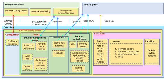 - Data plane—The data plane is composed of forwarding devices that can store, forward, or process data according to the flow rules sent by the control plane. In KDN, the data plane is required to send data requested by the management and control planes [];
