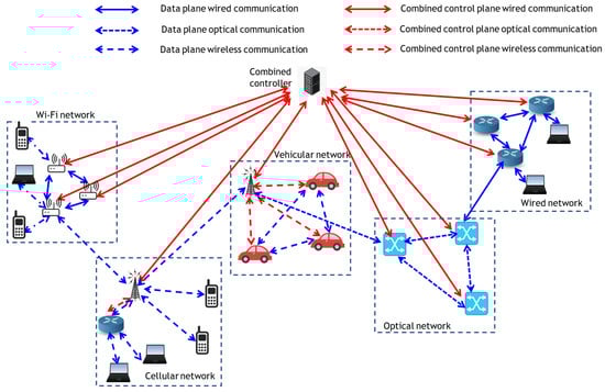 The literature that is now available describes four types of functionally centralized control architecture for the SDN based on the organizational structure of the data and control planes: fully hierarchical, hierarchical data plane, hierarchical control plane, and standard. A fully hierarchical architecture contains tiered data and control planes that are separated into upper and lower planes []. The upper data plane is made up of border network forwarding devices such as wireless access points, eNodeB, and gNodeB, while the lower data plane is made up of SDN-enabled nodes. The upper control plane has an overall picture of the network and is made up of SDN controllers of the primary network. The lower control plane is responsible for controlling the subsystems of the network and is made up of SDN controllers of the edge network connected to the upper control plane by a cable network. Because multiple secondary SDN controllers may be allocated to different parts of the network, this design provides the maximum level of agility and programming abilities. The control plane in a hierarchical data plane SDN architecture is non-hierarchical, whereas the data plane is separated into lower and upper data planes []. The data plane in a hierarchical control plane SDN architecture is not separated into upper and lower data planes, but the control plane is []. The control plane is totally centralized and has the least adjustability in the standard SDN architecture, which is equivalent to the original SDN planes []. The standard SDN paradigm is the most generally used design, while the full hierarchical SDN structure is the most rarely utilized model by academics as a result of its more complicated nature in terms of control and implementation, according to the study conducted in [].