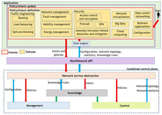 - Application plane—This plane provides a platform for network applications to communicate requirements to the underlying network infrastructure. It also enables network administrators to define network policies specific to applications and define network configuration policies that are more aligned with high-level business needs and objectives in a centralized manner, where the application logic is decoupled from hardware. In KDN, application policies can be dynamically updated based on knowledge [].