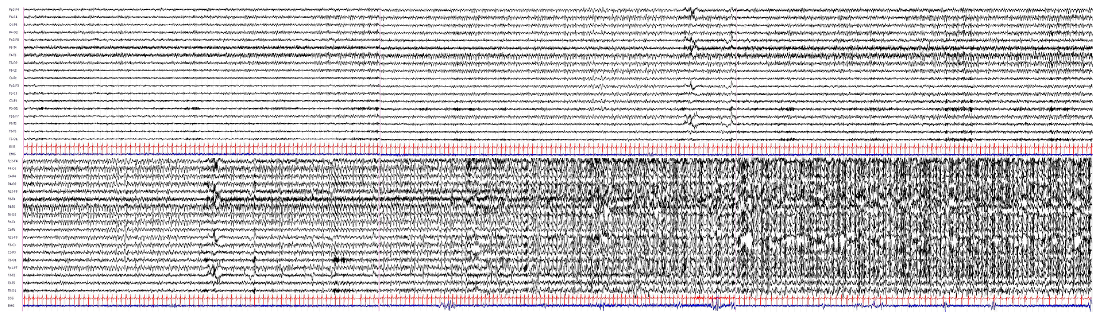 Ictal EEG (60 s/page). Rhythmic theta activity (5 Hz) evolving into delta activity (2–3 Hz) with sharp components arising from the right temporal lobe (T4-T6) then spreading to the ipsilateral parietal and frontal lobes. After 180 s a bilateral involvement of the frontal lobes appears. Then, a morphology evolution toward a spike and wave and poli-spike and wave discharges at 2 Hz is visible, and the epileptic activity becomes diffuse with a frontal predominance. The seizure ends abruptly after 8 min.