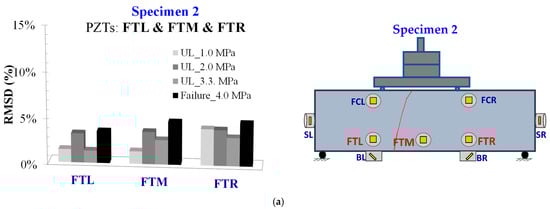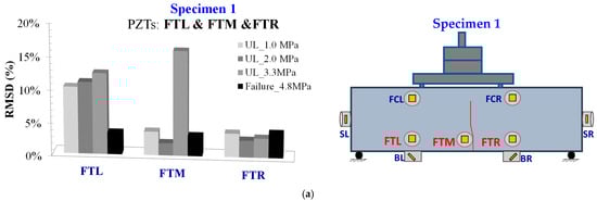 PZTs FTR, FTM, and FTL were placed in the tensional zone to the right, middle, and left of the mid-span of Specimen 2, respectively. All the PZTs had parallel polarization direction to the finally formed failure. The recorded data of the transducers could not be employable enough as all the PZTs had similar voltage responses and RMSD and mRMSD values, as displayed in Figure 17 and Figure 18, respectively. More significant discrepancies between the mRMSD signatures at FTM PZT can be observed in Figure 18.