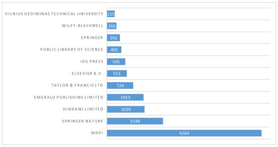 The publishers of articles pertaining to the use of MCDM methods across various fields of sustainable engineering are diverse and include well-known names such as Springer Nature, Elsevier, Wiley-Blackwell, and Taylor & Francis Ltd. (Figure 1). However, the publisher with the most articles published in this field is MDPI, with 4264 articles. Other publishers with a significant number of articles include Hindawi Limited, Emerald Publishing Limited, and IOS Press. The list also includes smaller publishers such as the Rural Outreach Program and Dr. M.N. Khan, indicating a wide range of contributors to this field. The diversity of publishers reflects the multidisciplinary nature of sustainable engineering, where different fields intersect and collaborate to achieve sustainable solutions.