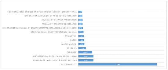 The journal Sustainability has the most publications on the topic, with 2290 articles, followed by the Journal of Intelligent & Fuzzy Systems and Mathematical Problems in Engineering, with 440 articles each (Figure 2). PLoS ONE and Energies also have a significant number of publications, with 401 and 220 articles, respectively. The topics covered by the publications include environmental management, energy production and consumption, transportation, water management, and quality and reliability management, among others. The use of MCDM methods allows for the consideration of multiple criteria in decision-making, which is considered essential in achieving sustainability in engineering practices.