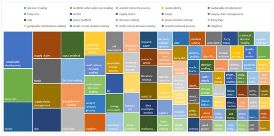 The assortment of literature pertaining to the application of MCDM methods in sustainable engineering covers a wide range of subjects, as shown in the list of the most frequent keywords (Figure 3). Decision-making and MCDM are the most common subjects, with a total of 1433 and 1318 articles, respectively, followed closely by the analytic hierarchy process (AHP), with 1293 articles. Sustainability, sustainable development, fuzzy sets, and supply chains are also important subjects, with over 500 articles each. Other notable subjects include risk assessment, renewable energy sources, geographic information systems, fuzzy logic, and multi-criteria decision-making. The literature also covers specific applications such as company business management, construction projects, logistics, waste management, water supply, and power resources. The research regarding the use of MCDM methods in sustainable engineering is diverse and covers a wide range of subjects, reflecting the broad scope of sustainable engineering as a field of study.