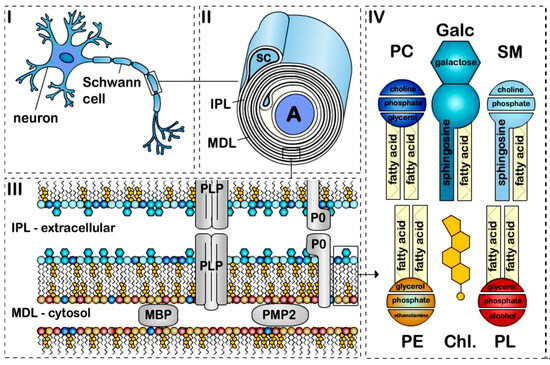 Cholesterol and Sphingolipids contribute to the formation of the characteristical compact and multilamellar structure of myelin to a greater extent than in conventional biological membranes. Even minor alterations in the lipid composition of myelin can affect the adhesive properties between membranes, potentially leading to the destabilization and breakdown of myelin structures, as well as the development of severe neurological disorders [].