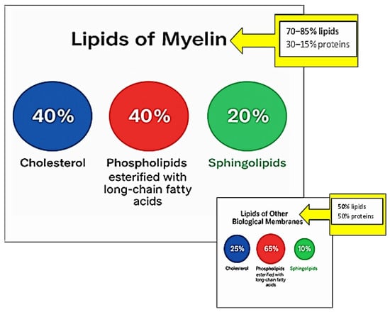 The myelin sheath is characterized by a high lipid content (70–85%) and, consequently, a low protein fraction (15–30%). In contrast, most biological membranes have approximately equal proportions of protein and lipid (50% lipid/50% protein) []. This high lipid-to-protein ratio in myelin contributes to its tight packing and compact organization through noncovalent lipid–protein interactions []. Moreover, enrichment in specific lipid classes is also necessary for long-term myelin maintenance []. Myelin’s lipid composition is distinctive: it contains high levels of cholesterol and is enriched in glycolipids, in a 40:40:20 ratio (cholesterol:phospholipid:glycolipid) compared to most biological membranes (25:65:10) []. Figure 2 schematically summarizes the distinctive lipid composition of the myelin membrane in comparison to biological membranes.