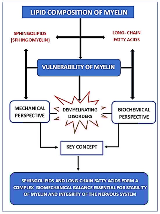 We analyze studies that correlate the mechanical vulnerability of myelin with its lipid composition, particularly sphingomyelin, thereby underscoring its role in protecting neurons against physical stress and providing a robust microstructural network that reinforces the white matter as a whole. It is evident that the structural integrity and stability of the myelin membrane are fundamental for normal nervous system function. Its degradation or dysgenesis leads to devastating neurocognitive consequences. A pioneering study by O’Brien [] related myelin membrane stability to intermolecular cohesion among its lipid constituents, given myelin’s exceptionally high lipid content. According to O’Brien, both physiological and clinical findings supported the concept that an excess of polyunsaturated lipids or a deficiency of long-chain sphingolipids could render the membrane more prone to disruption. The key prediction arising from these speculations was that myelin could become unstable in disease states if its lipid composition shifted toward higher proportions of polyunsaturated fatty acids and lower proportions of very-long-chain fatty acids. Sixty years ago, the author acknowledged that these considerations would not fully explain myelin stability, since the molecular models used as references were simplifications of a highly complex structure whose exact molecular organization and sequence remained unknown.