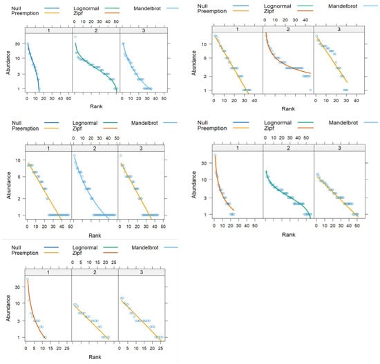 Rank–abundance curves of floral species in the five agroecosystems (left up-) artificial forest, (right up) mixed horticulture and fruticulture, (left middle) native forest, (right middle) dairy prairies, and (left up) soybean per patch (1, 2, 3), with the abundance axis being in relative terms. In its construction, the range of the species (on the abscissa axis) and the percentage of accumulated abundance (on the ordinate axis) were used. The Vegan package (R) and radfit function were used.