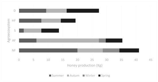 Seasonal production of honey in the different landscapes. Agroecosystems: D: dairy prairies; AF: artificial Eucalyptus sp. forest; HF: mixed horticulture and fruticulture; S: soybean crop; NF: native forest.