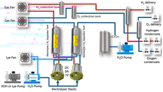 The BOP consists of electrolyzer stacks, where liquid electrolyte is fed with the help of a centrifugal pump premixed with water with another pump, which is called the electrolyte circulation pump. The electrolyte temperature is kept with the help of a heat exchanger and another fan, as shown in Figure 2. The minimum voltage requirement for an electrolyzer is 200 V and 17 A current from one stack. As the electrolyzer investigated here has two stacks, the total voltage and current requirements will be 400 V and 34 A. As the hydrogen generation steps progress, the gas will be collected in respective electrolyte–gas separation tanks. From here, it is collected into catch pots for both H2 and O2. After this step, it will be passed to the deoxo step, where condensates associated with both oxygen and hydrogen gases will be collected. The deoxo consists of packed bed Pt/Pd catalysts, which work by heating to around 200 °C. The oxygen generated is vented out into the air, and condensates associated with it will be directly collected from the output valve from the rear of the electrolyzer. The H2 generated is passed via the same step and finally collected in the drying chamber for removing the residual water molecule as well as condensate collection. After the drying step, the output H2 pressure is around 4.2 Nm3/h, giving a total of 369 g/h, which will result in 8.85 kg/day of electrolyzer operation. After the shutdown of the electrolyzer and the production target is reached, the dryer is working by condensation using heat exchanger plates with recovery and condensate drain devices. The temperature is controlled by a refrigerant chiller. The hydrogen constant dew point is obtained by these types of dryers.