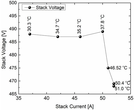 Next, to understand the correlation of stack voltage [V] against stack current [I], we have plotted them in Figure 3. From the results obtained, the trend is a linear pattern in which the stack voltage stays the same as the stack current increases in the range of 35–55 A. This phenomenon is due to the Ohmic losses related to the ionic resistance of the electrolyte. A similar type of observation had been made by an NREL study involving an alkaline electrolyzer equipped with power electronics []. The electrolyte temperature does play a role in the performance of stack current, as the electrolyte temperature influences it, and that is why it is cooled down with the help of the lye fan and heat exchanger as described in the balance of the plant. In addition to electrolyte temperature, overall, the electrolyzer system temperature increases from 37.8 °C to 51 °C. Above 37 °C, the stack voltage decreases further, and ultimately, the reaction engineering parameters such as output hydrogen pressure and gas flow become affected.