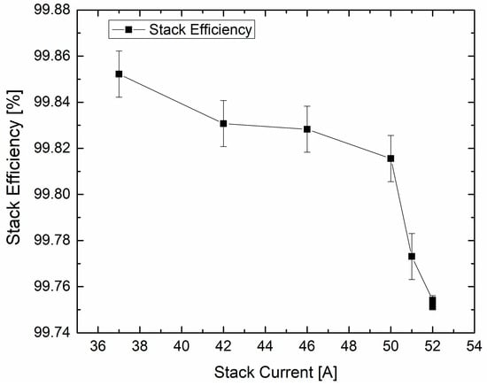 Correlation between stack efficiency (%) and stack current of the electrolyzer stacks.