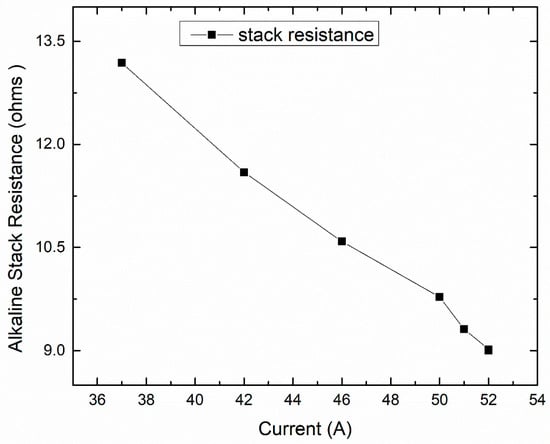 The variation in alkaline electrolyzer stack resistance concerning the current.