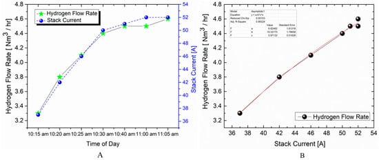 (A) Plot showing the correlation between hydrogen flow rate with stack current collected over different time periods. (B) Shows the exponential asymptotic growth (red line) of the hydrogen flow rate with the stack current.