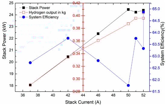 System efficiency is defined as the amount of energy needed to produce 1 kg of H2. For a system to be 100% efficient, an output power of 39.4 kWh/kg is needed []. Based on this, we have calculated the system efficiency, and it is plotted against the stack power, stack current, and amount of H2 generated in kg. The results obtained are shown in Figure 7. From here, it is found that the system efficiency is maximum when the stack current is highest, and here, we have seen the highest hydrogen production capacity of 0.42 kg. The system efficiency is calculated and is found to be 65%. The system efficiency, stack power (kW), and hydrogen output (kg) all match the same stack current, which is 52 A, where stack resistance is still at minimum. So, we finally conclude here that 52 A is the ideal current to have maximum hydrogen output as well as support the capacity of the electrolyzer, which is 25 kW.