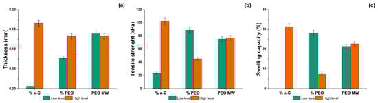 Effect of the outcome variables κ-carrageenan (κ-C) and polyethylene oxide (PEO) on the (a) thickness, (b) tensile strength, and (c) swelling capacity of κ-C-PEO films.