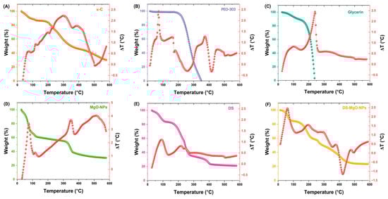 (A–F) TGA and DTA analyses of DS and DS-MgO-NPs utilized for their preparation. The analysis of raw materials utilized for their development is also depicted in this figure: κ-C; κ-carrageenan; PEO-303; polyethylene oxide 303; MgO-NPs, magnesium oxide nanoparticles. The analyzed samples (DS and DS-MgO-NPs) correspond to sample 4, which was selected according to optimization evaluation.