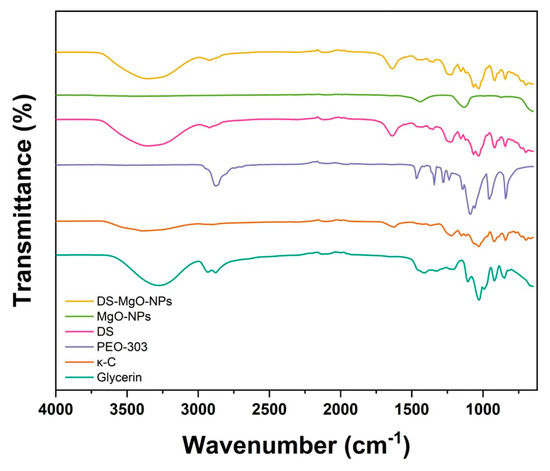 The chemical composition of DS and DS-MgO-NPs together with the raw materials utilized for their development is represented in Figure 4. For DS, the 3400 cm−1 band can be related to the stretching vibration of hydroxyl groups, whereas the bands at 2800 and 1200 cm−1 can be associated with the stretching of methyl groups. The peaks presented at 1250 cm−1 can correspond to sulfate esters, which are representative of κ-carrageenan. Similarly, the FTIR spectrum of DS-MgO-NPs demonstrates the stretching of hydroxyl and methyl groups at 3400 and 2800 cm−1, respectively. However, it also contained broad peaks related to the stretching (800–600 cm−1) and bending (500–400 cm−1) vibrations of Mg–oxygen bonds. Comparably, the FTIR spectra of PEO 303 and glycerin demonstrated the stretching of hydroxyl, methyl, and carbonyl groups. Regarding the analysis of DS, it was noted that the signal intensity of the peaks decreased to 648.55–775.28 cm−1, which may be associated with the carbonyl stretching and glycoside bond interaction between κ-carrageenan and PEO 303. Similar findings have been reported in other studies involving the use of these polymers for hydrogel membrane development [].