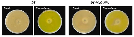 Infectious diseases can be caused by pathogenic microorganisms such as bacteria, fungi, viruses, and parasites. In contrast to other disorders, infections caused by bacteria are challenging to treat due to their multiple drug-resistance mechanisms. E. coli is a Gram-negative bacterium that, in the clinical pipeline, can cause diarrhea, vomiting, sepsis, or neonatal meningitis []. During wound healing, E. coli is considered an opportunistic pathogen that can lead to localized pain, redness, or severe disorders such as peritonitis. P. aeruginosa is another opportunistic Gram-negative pathogen related to respiratory, urinary, and wound infections []. The persistence of P. aeruginosa in contaminated surfaces such as medical equipment is associated with delayed epithelialization, inflammation, and increased pain []. Here, it was recorded that treatment did not inhibit the growth of E. coli nor P. aeruginosa when slices of DS or DS-MgO-NPs were placed into Petri dishes.