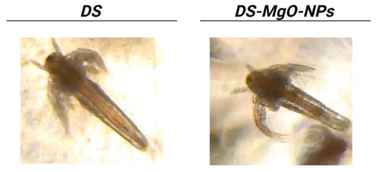 As represented in Figure 6, A. salina nauplii exposed to DS and DS-MgO-NPs did not present significant anatomical aberrations. In addition, treatment with the developed films did not decrease their viability.
