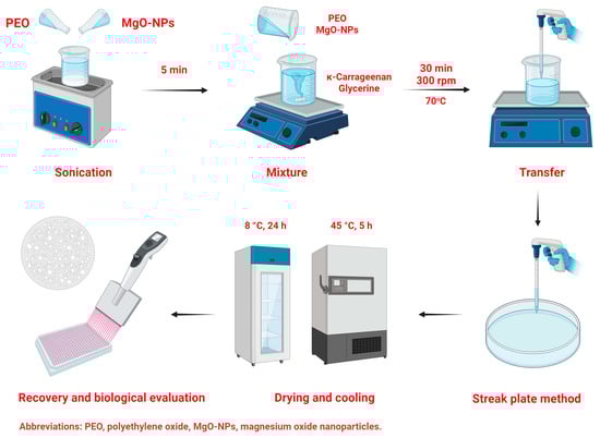 To develop κ-C-PEO films, two systems were prepared in separate containers containing 50% of the total water. PEO was added to the first container, and κ-C with glycerin at 70% of the polymer weight was incorporated into the second. Both solutions were maintained for 30 min under agitation at 300 rpm and 70 ± 5 °C. Subsequently, the two systems were mixed for 30 min at the same stirring speed and temperature. Then, 6.5 mL of the resulting mixture was poured into a glass Petri dish with dimensions of and dried in an oven at 45 ± 5 °C for 5 h. After this period, the obtained κ-C-PEO was refrigerated at 8 °C for 1 day. The same procedure was repeated to reinforce κ-C-PEO films with 1.0% w/w of MgO-NPs previously dispersed into the PEO system. The percentage of raw materials was considered based on the design matrix. Scheme 1 represents the synthesis process of κ-C-PEO films.