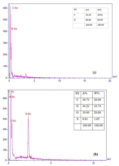 In the spectrum of g-C3N4@Bu-SO3H, which is shown in Figure 5b, the two peaks 2781 and 2758 cm−1 are related to C–H groups in 1,4-butane-sultone. The symmetric and asymmetric stretching vibration modes of SO2 have appeared in the regions 1220 and 1348 cm−1, the characteristic peaks at 1176 and 1207 cm−1 are related to S–OH bonds.