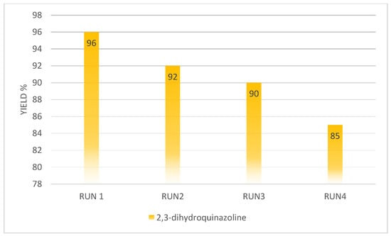 Reusability of g-C3N4@Bu-SO3H catalyst was examined for synthesis of 2,3-dihydroquinazolines derivatives in four runs, the considering Figure 9, reaction yield was decreased considerably after third run.