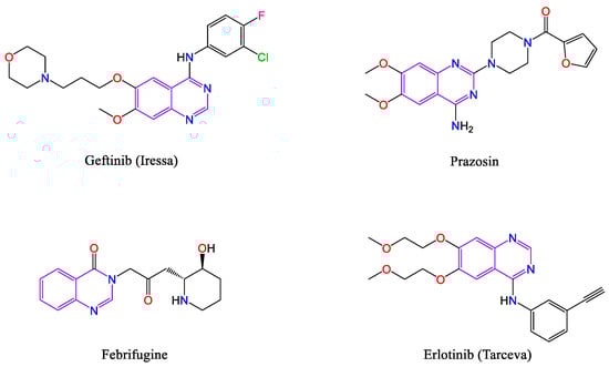 Quinazolines and their derivatives are as a significant class of nitrogen-containing heterocyclic scaffolds that the structure of these compounds have been formed from six-membered fused rings []. Accordingly, these quinazolines derivatives have numerous biological activities, including anticancer, antimalaria, antimicrobial, antiviral, anti-HIV, anti-inflammatory, antifungal, acaricidal, weedicide, antidepressant, anticonvulsant, muscle relaxant, and so on [,]. On the other side, because of various biological values, they are utilized for synthesis of considerable drugs such as prazosin (treatment of benign prostatic obstruction) [], geftinib (antitumor therapeutic agents) [,], erlotinib (EGFR inhibitor) [], lapatinib (tyrosine kinase inhibitor) [], alfuzosin (anticancer) [], febrifugine (antimalaria) [], and etc. (Scheme 1).