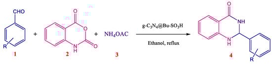 Synthesis of 2,3-dihydroquinazoline derivatives using g-C3N4@Bu-SO3H metal-free catalyst.