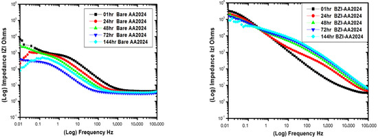 The EIS impedance data for the bare and BZI-AA2024 samples; run-in period of the 144 h immersion test is shown in Figure 3. Starting from one hour of immersion of the bare-AA2024, a low impedance of about 3 ohms.cm2 was observed at high frequencies between 103 and 105 Hz. This is attributed to surface interface and solution resistance. Furthermore, it slightly decreased to about 2.6 ohms.cm2 after 144 h immersion at a low frequency from 0.1 to 0.01 Hz; the impedance generally decreased from the 1 h to 144 h.