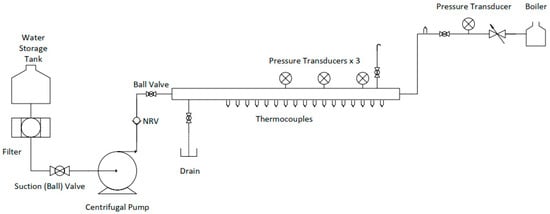 The experimental facility setup at PIEAS is shown schematically in Figure 1. The parameters shown in Table 1 are selected because they are the most commonly occurring conditions in the steam condensate recovery systems wherein steam is present at relatively higher temperatures (60–70 °C) and lower pressures (1–2 bar). The setup majorly comprises an electric boiler with a surge tank, a circular Perspex pipe (main test section), an orifice-type nozzle, temperature and pressure instrumentation, and steam medium piping. The transparent Perspex pipe (72 inch long and 2¼ inch OD; L/D~36) resembles Datta’s [] test section (stainless steel pipe having L/D~30) and has K-type thermocouples (M8, probe length = 1 inch, ~0.5 K accuracy) and four pressure transmitters (0.2% FS accuracy) installed on it; all instruments were duly calibrated, captured by high-speed camera, and recorded by a DAQ system (Pangu Automation System Co., Ltd., VX8124R, Hangzhou, China). The saturated steam was injected horizontally as a stable sonic jet in the Perspex pipe via a nozzle. Steam plume shapes were captured for horizontal steam injection against a water degree of subcooling at different steam injection pressures.