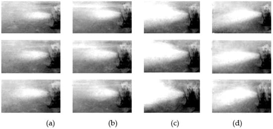 Variations in steam plumes with increasing water temperature (plume elongation) at 1.5 bar: (a) conical plumes; (b) elliptical plumes; (c) divergent plumes; (d) plumes with an inclination angle.