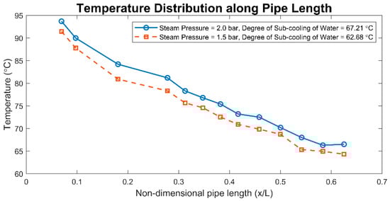 - The temperature distributions obtained for two different steam pressure and water temperature values show decreasing trends along pipe length in a similar fashion.